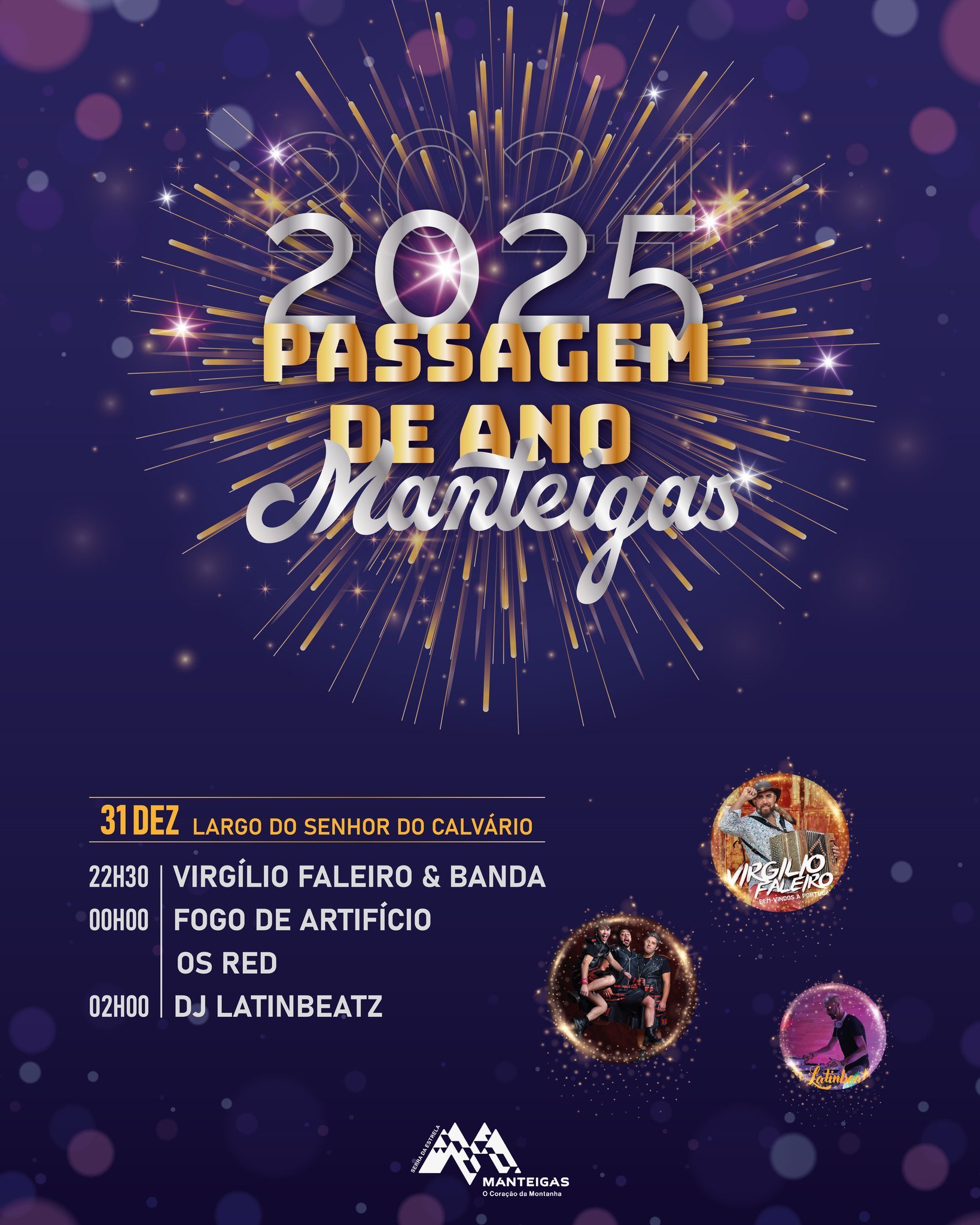 Passagem de Ano 2024 - Manteigas ? Dia 31 de dezembro 2024 | 22h30 ? Largo do Senhor do Calvário ? Virgílio Faleiro & Banda ? Fogo de Artifício ? Os Red ? DJ LatinBeatz