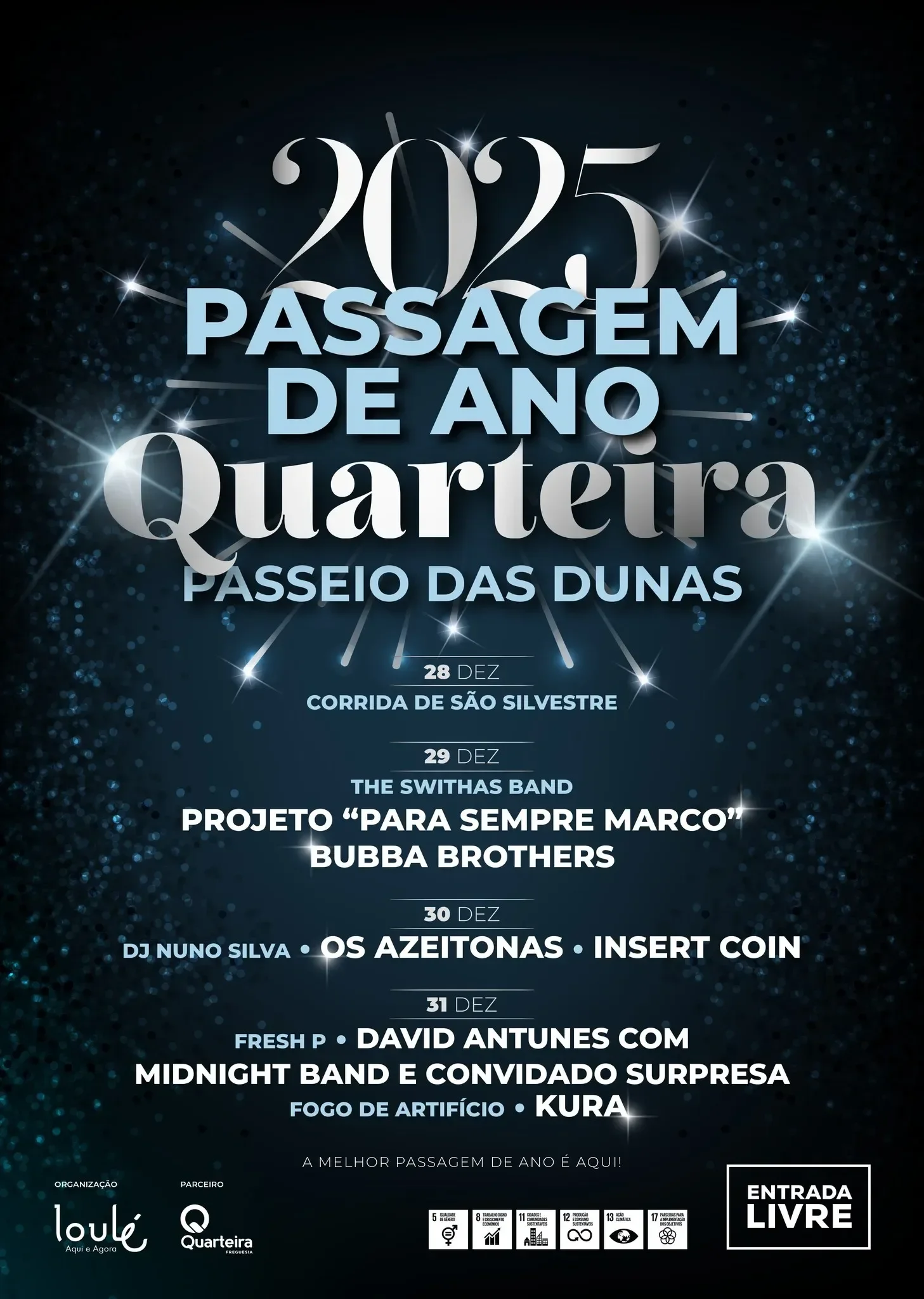 Passagem de Ano 2024 - Quarteira Programa: 28 de dezembro Corrida de São Silvestre 29 de dezembro Switha Band Projeto "Para Sempre Marco" Bubba Brothers 30 de dezembro DJ Nuno Silva Os Azeitonas Insert Coin 31 de dezembro Fresh P David Antunes & Midnight Band e convidado surpresa! FOGO DE ARTIFÍCIO DJ Kura Todas as iniciativas são de entrada livre.