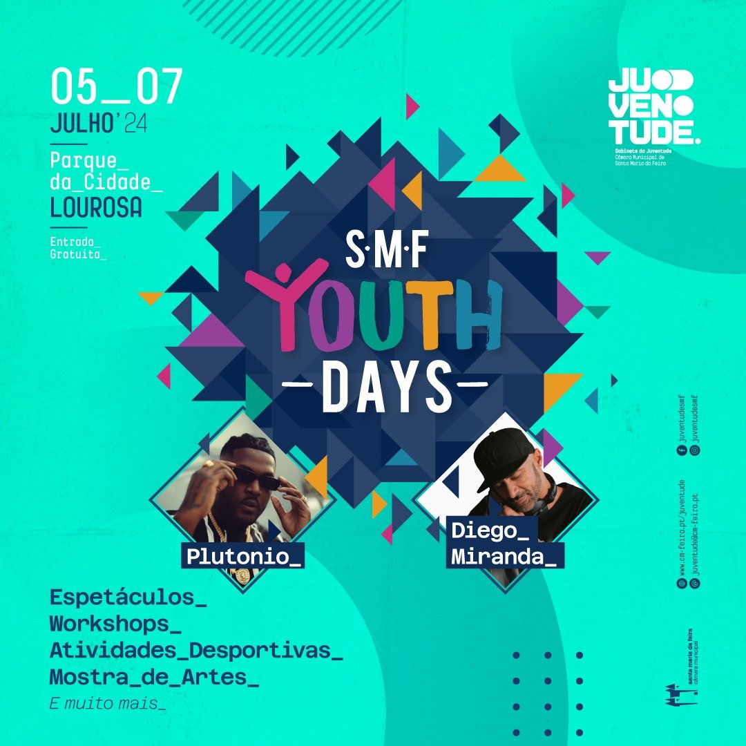 SMF Youth Days 2024 - Lourosa Programa: ? Plutonio ▪ Data: 5 de julho ▪ Hora: 22h00 ▪ Local: Parque da Cidade de Lourosa ▪ Entrada: gratuita ? Diego Miranda ▪ Data: 6 de julho ▪ Hora: 22h00 ▪ Local: Parque da Cidade de Lourosa ▪ Entrada: gratuita