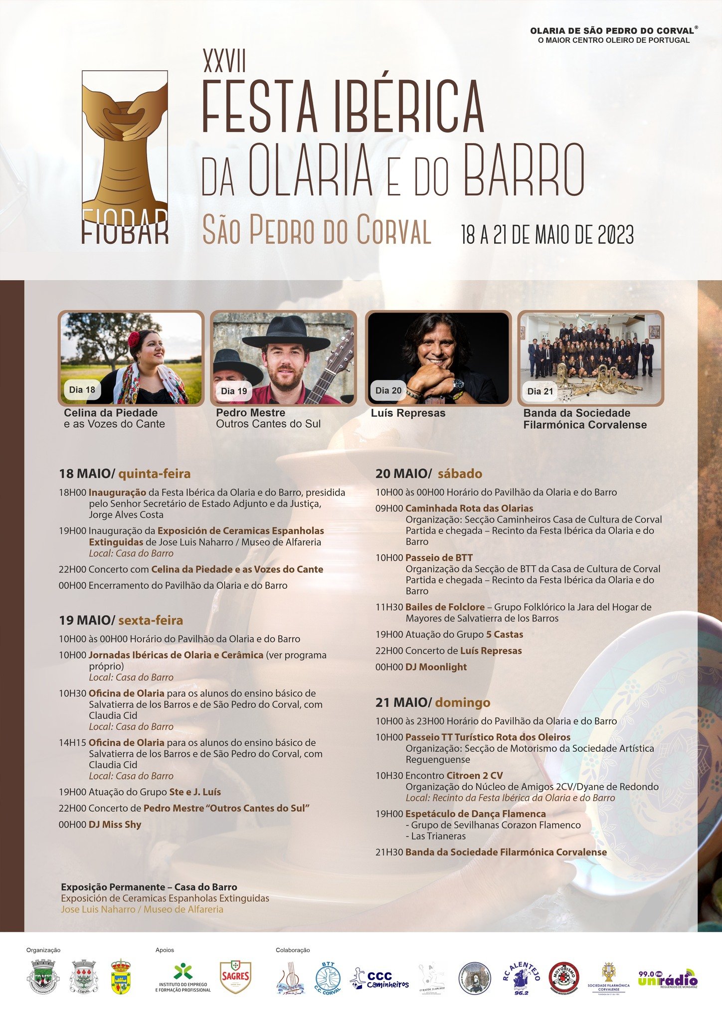 XXVII Festa Ibérica da Olaria e do Barro São Pedro do Corval, de 18 a 21 de maio de 2023 18 MAIO/ quinta-feira 18H00 Inauguração da Festa Ibérica da Olaria e do Barro, presidida pelo Senhor Secretário de Estado Adjunto e da Justiça, Jorge Alves Costa 19H00 Inauguração da Exposición de Ceramicas Espanholas Extinguidas de Jose Luis Naharro / Museo de Alfareria Local: Casa do Barro 22H00 Concerto com Celina da Piedade e as Vozes do Cante 00H00 Encerramento do Pavilhão da Olaria e do Barro 19 MAIO/ sexta-feira 10H00 às 00H00 Horário do Pavilhão da Olaria e do Barro 10H00 Jornadas Ibéricas de Olaria e Cerâmica (ver programa próprio) Local: Casa do Barro 10H30 Oficina de Olaria para os alunos do ensino básico de Salvatierra de los Barros e de São Pedro do Corval, com Claudia Cid Local: Casa do Barro 14H15 Oficina de Olaria para os alunos do ensino básico de Salvatierra de los Barros e de São Pedro do Corval, com Claudia Cid Local: Casa do Barro 19H00 Atuação do Grupo Ste e J. Luís 22H00 Concerto de Pedro Mestre “Outros Cantes do Sul” 00H00 DJ Miss Shy 20 MAIO/ sábado 10H00 às 00H00 Horário do Pavilhão da Olaria e do Barro 09H00 Caminhada Rota das Olarias Organização: Secção Caminheiros Casa de Cultura de Corval Partida e chegada – Recinto da Festa Ibérica da Olaria e do Barro 10H00 Passeio de BTT Organização da Secção de BTT da Casa de Cultura de Corval Partida e chegada – Recinto da Festa Ibérica da Olaria e do Barro 11H30 Bailes de Folclore – Grupo Folklórico la Jara del Hogar de Mayores de Salvatierra de los Barros 19H00 Atuação do Grupo 5 Castas 22H00 Concerto de Luís Represas 00H00 DJ Moonlight 21 MAIO/ domingo 10H00 às 23H00 Horário do Pavilhão da Olaria e do Barro 10H00 Passeio TT Turístico Rota dos Oleiros Organização: Secção de Motorismo da Sociedade Artística Reguenguense 10H30 Encontro Citroen 2 CV Organização do Núcleo de Amigos 2CV/Dyane de Redondo Local: Recinto da Festa Ibérica da Olaria e do Barro 19H00 Espetáculo de Dança Flamenca - Grupo de Sevilhanas Corazon Flamenco - Las Trianeras 21H30 Banda da Sociedade Filarmónica Corvalense